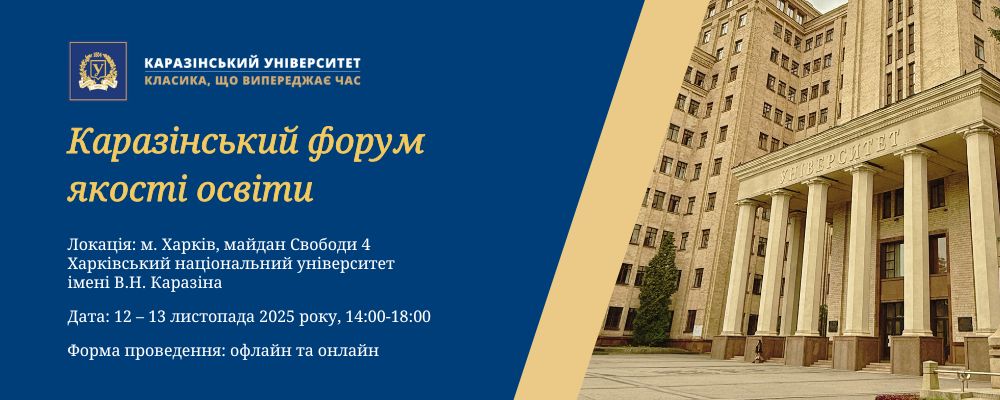 12–13 листопада 2025 року в Харківському національному університеті імені В. Н. Каразіна відбудеться Каразінський форум якості освіти — масштабна подія, присвячена актуальним питанням забезпечення та розвитку якості вищої освіти.