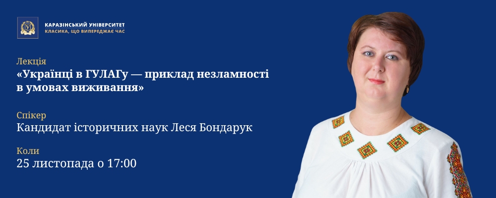 25 листопада в Каразінському університеті відбудеться лекція Лесі Бондарук — співробітниці Українського інституту національної пам’яті, журналістки, громадської діячки, педагогині та науковиці. Вона досліджує український рух опору в радянських концтаборах, історію ОУН і УПА та радянську репресивну політику. Авторка низки важливих праць, серед яких: «Михайло Сорока», «Проект "Україна": Волинь 1939–1946: окупована, але нескорена» (у співавторстві), «Прямостояння. Українці в особливих таборах ГУЛАГу», «Справа Гончарука. Останній розстріляний повстанець».