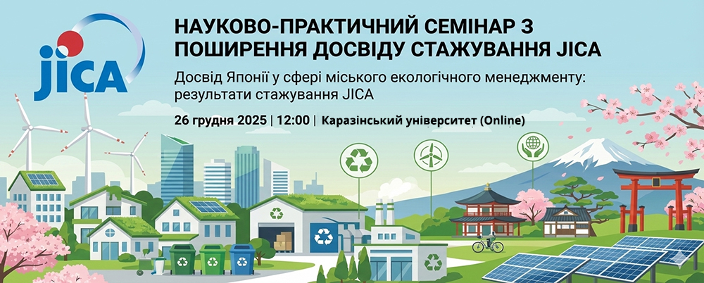 26 грудня запрошуємо взяти участь у науково-практичному семінарі Каразінського ННІ екології, зеленої енергетики та сталого розвитку «Досвід Японії у сфері міського екологічного менеджменту: результати стажування JICA» за результатами міжнародного стажування JICA Knowledge Co-Creation Program (Young Leaders).
