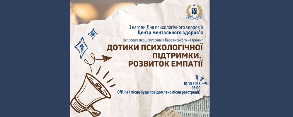 З нагоди Дня психічного здоров’я Центр ментального здоров’я запрошує студентів-першокурсників взяти участь у тренінгу, присвяченому розвитку емпатії та навичок психологічної підтримки, який відбудеться 10 жовтня 2025 року.