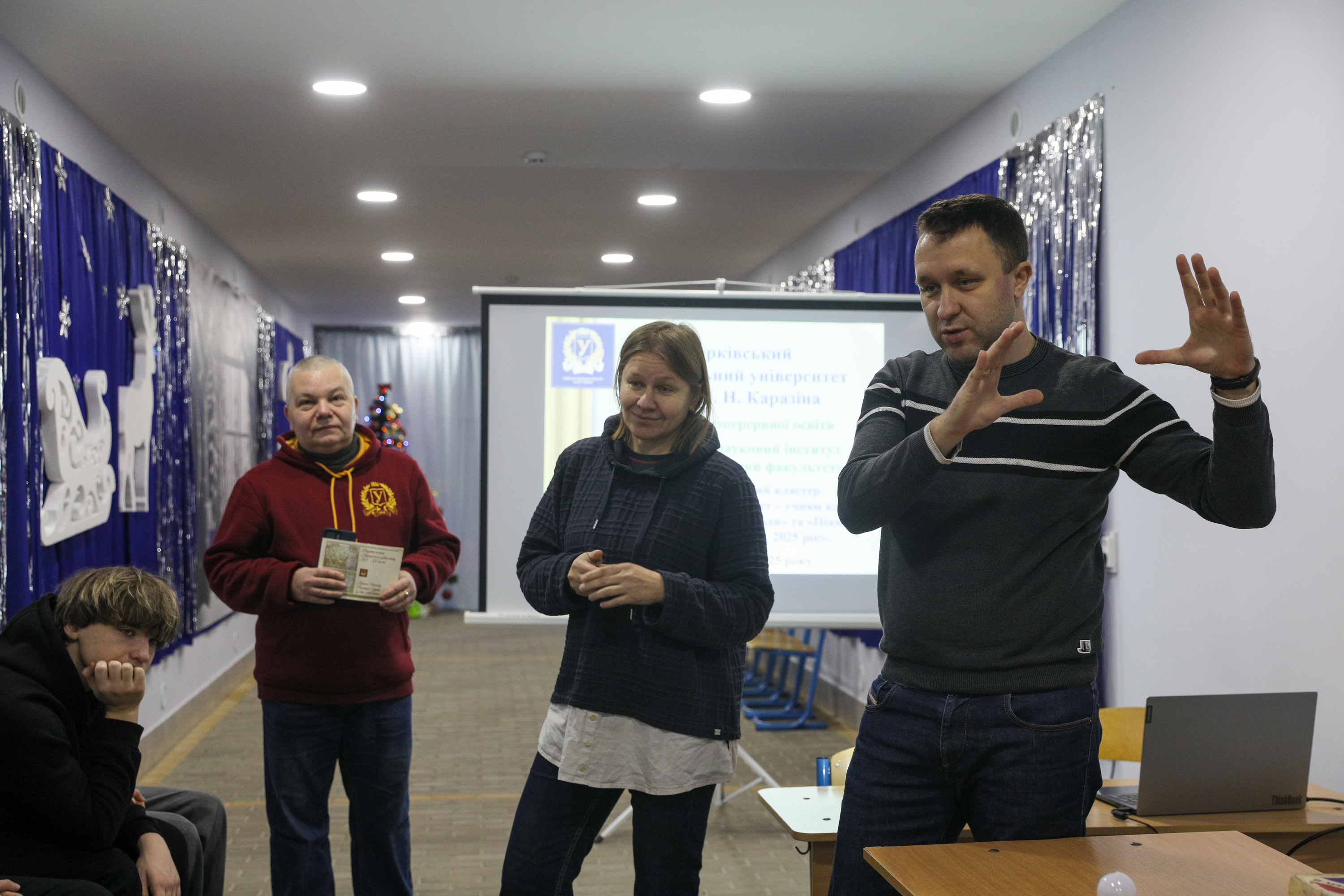 At the beginning of the event, Mykhailo Tatarynov, Director of the Institute of Continuing Education, welcomed the lyceum students and teachers participating in the cluster, congratulated them on the upcoming New Year holidays, introduced the format of the practical and research-based sessions, conducted a safety briefing, and presented the tutors involved in the programme. These included Pylyp Kuznetsov, Director of the Education and Research Institute “School of Physics and Technology”; Inna Afanasieva, Associate Professor of the Department of Applied Physics and Plasma Physics; Oleksandr Hapon, Senior Lecturer of the same department; and Mykyta Kyrpychov, a third-year student of the institute.