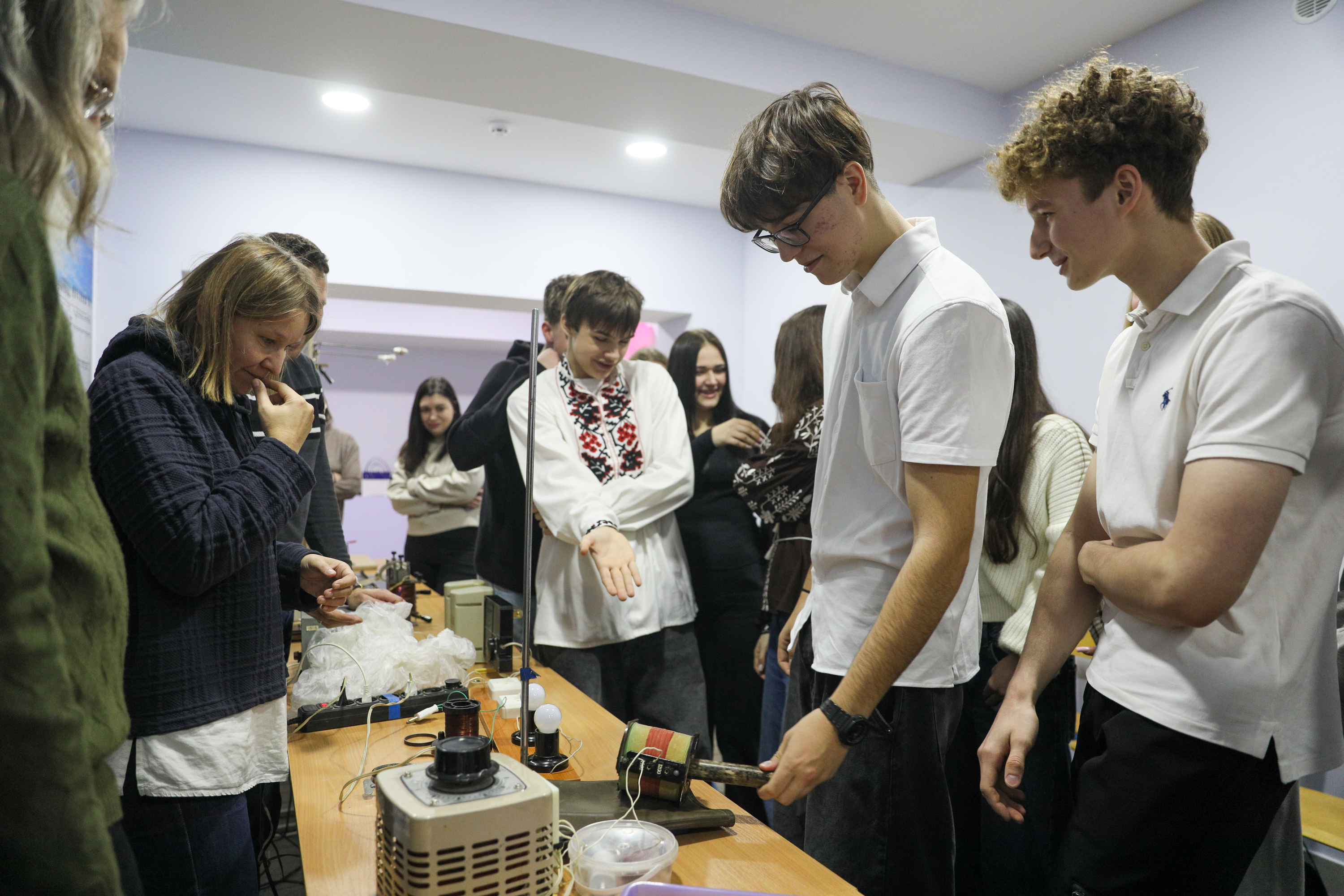 During the cascade practical and research-based sessions in physics and technology conducted by Inna Afanasieva and Oleksandr Hapon, students and their teachers worked with specialised equipment while performing a series of engaging tasks. These included experiments on electromagnetic phenomena, measurement of the Ampère force, familiarisation with the operating principles of the Maklakov hammer, use of Helmholtz coils, application of induction metal melting technologies, and operation of a Geiger counter. Based on the results of the activities, the lyceum students received valuable gifts from the academic staff of the Faculty of Physics and Technology for the most effectively completed tasks.