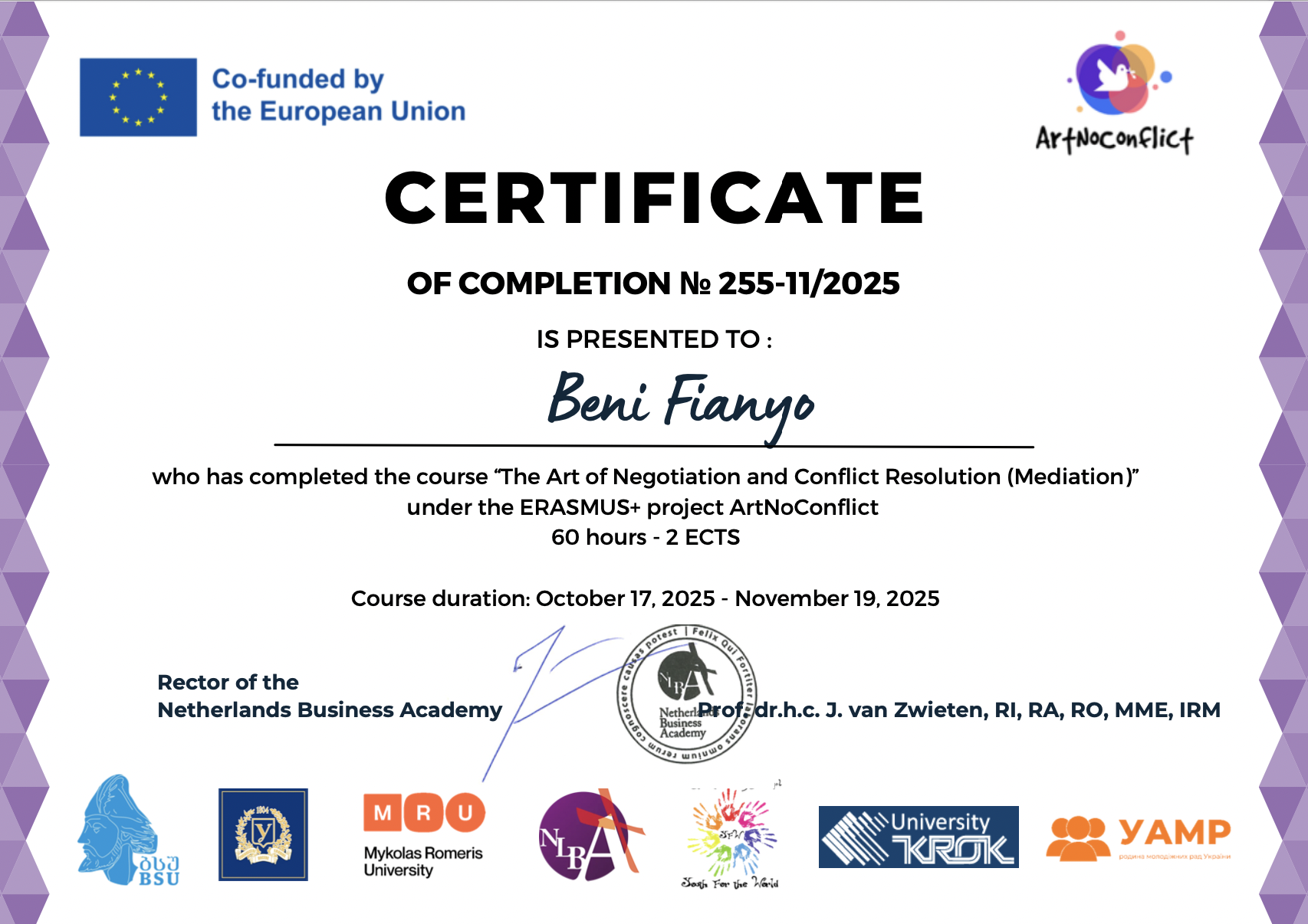 Усі учасники, які виконали вимоги програми, отримали сертифікати, що підтверджують успішне завершення курсу в межах проєкту "ArtNoConflict".