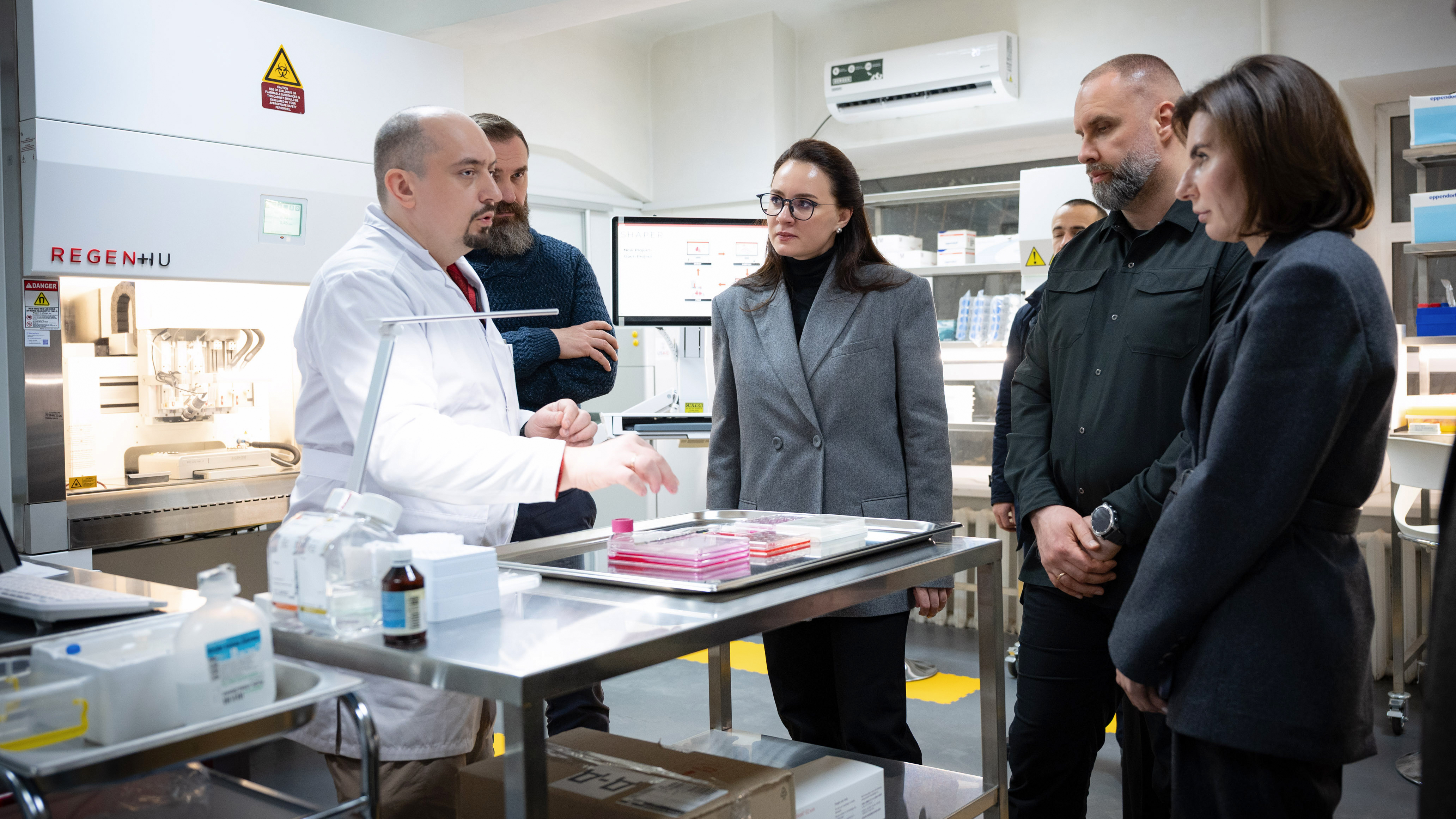 Після завершення основної частини зустрічі гості відвідали міждисциплінарну навчально-наукову лабораторію біомедичних досліджень KarazinBioMed, де ознайомилися з напрямами сучасних наукових розробок. Юрій Кот, завідувач кафедри біохімії та керівник лабораторії, розповів про інноваційні підходи в біомедичних дослідженнях та потенційні можливості впровадження здобутих результатів у практику.